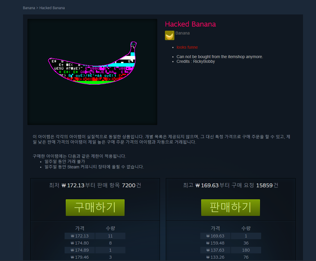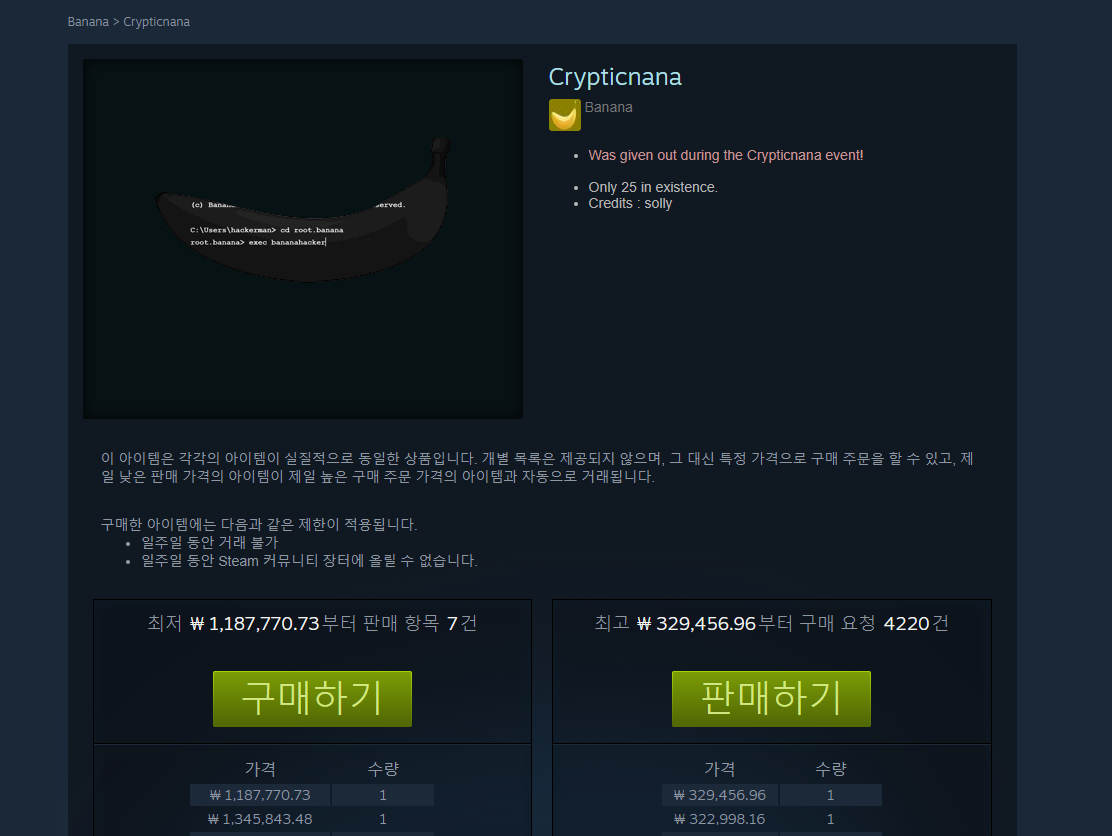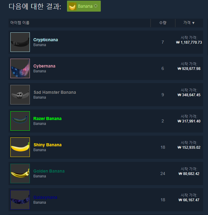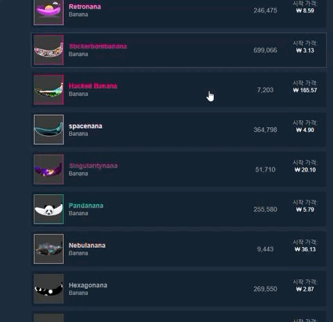 스팀 장터를 둘러보시면 정말 여러 종류의 바나나들이 판매되고 있는 것을 보실 수 있습니다.