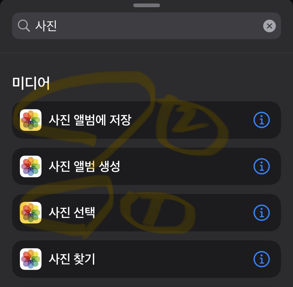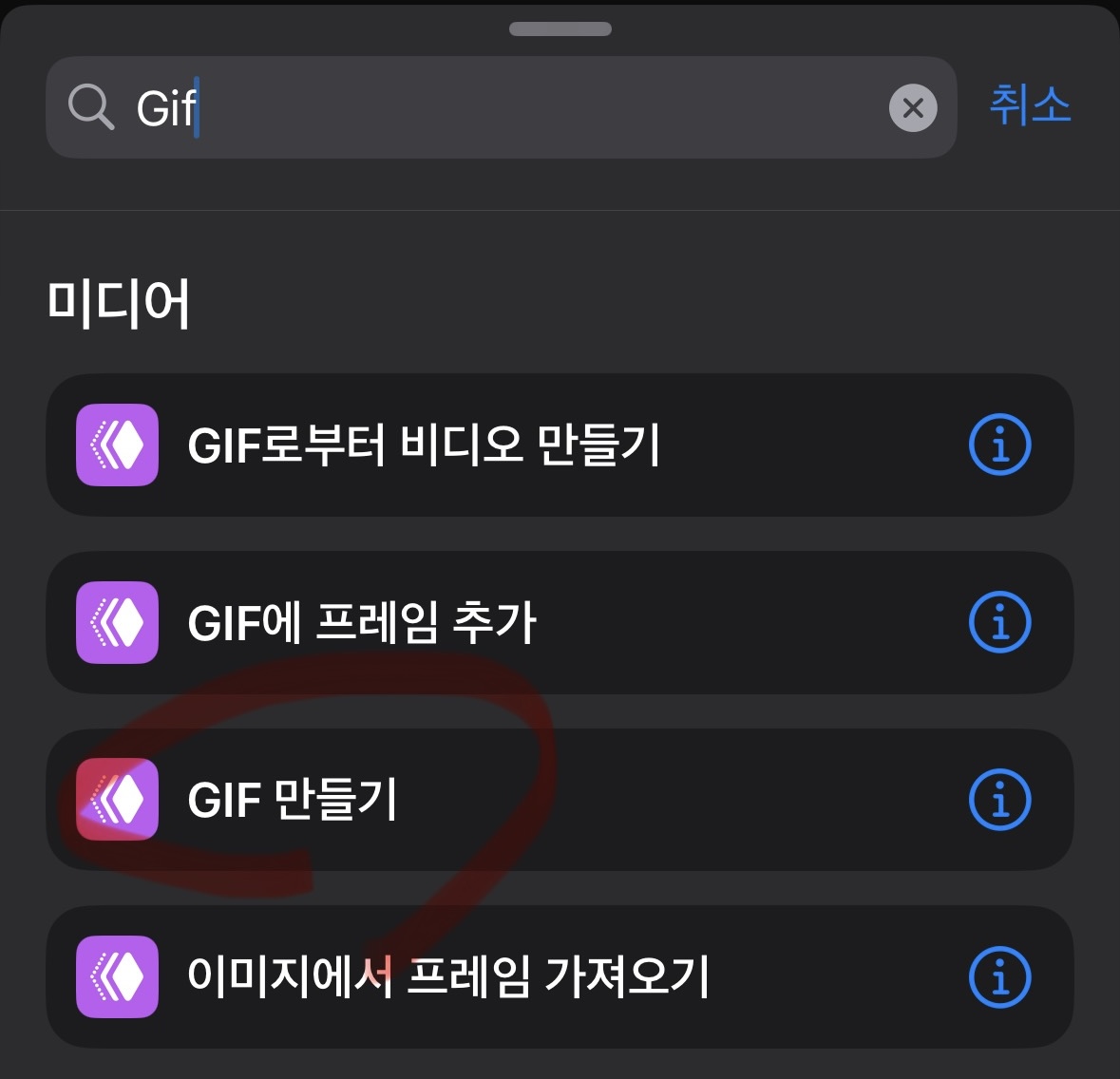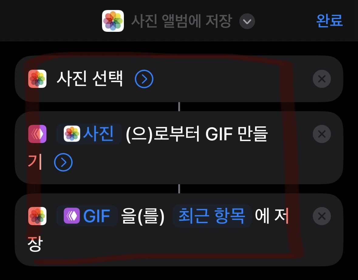 이후 먼저 사진 이라고 검색을 하시면 저렇게 목록들이 쭉 나오게 됩니다. "사진 선택 - 사진 앨범에 저장" 순서로 눌러주시면 됩니다. 마지막으로 GIF를 검색하셔서 GIF 만들기를 클릭해주시면 해당 단축어가 만들어집니다.