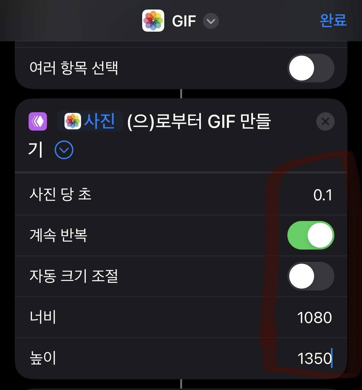 저희가 만드는 단축어는 저화질의 GIF가 아니라 고화질의 GIF이기 때문에 설정을 조금 변경해야 합니다. 사진과 같이 사진 당 초 0.1, 계속 반복 ON, 자동 크기 조절 OFF 너비 1080, 높이 1350에 맞춰주시면 됩니다.