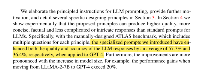 해당 논문은 "Principled Instructions Are All You Need for Questioning LLaMA - 1/2, GPT - 3.5/4"라는 제목의 논문으로 LLaMA 나 ChatGPT와 같은 대형 언어 모델에서 프롬프트를 작성할 때 좀 더 좋은 응답을 얻을 수 있도록 하는 26가지의 방법에 대하여 서술하고 있습니다. 해당 논문은 무료 공개 되어 있기 때문에 위에 첨부된 링크로 들어가시면 직접 읽어보실 수 있습니다.