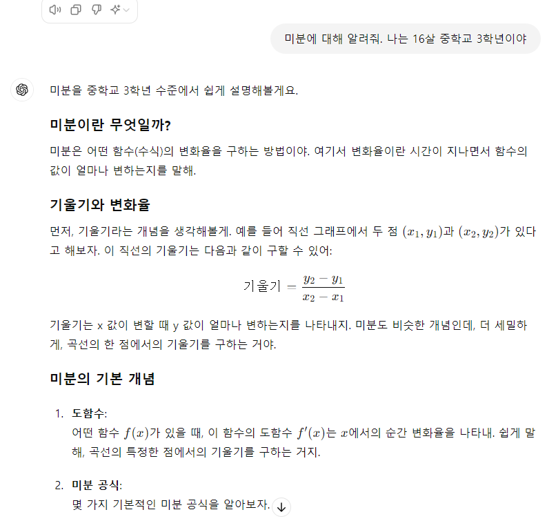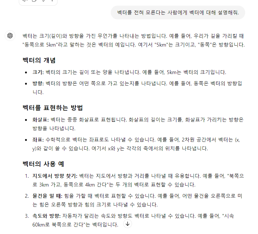 여러분들이 만약 양자 역학이나 블록체인 기술과 같은 복잡한 주제에 대한 질문을 한다면 이해하는데 최대한 명확하고 쉬운 내용을 받아야 합니다. 단순하게 "양자 역학에 대해서 설명해 줘", "블록체인 기술에 대해 설명해 줘."라고 하면 여러분들이 이해하기 쉬운 답변을 받지 못할 수도 있습니다. 그렇기 때문에 "내가 11살이라고 생각하고 양자역학에 대해 설명해 줘", "내가 블록체인 기술을 처음 배우는 사람이라고 생각하고 알려줘."라고 프롬프트를 입력하면 최대한 쉽게 설명을 해주려고 할 겁니다.