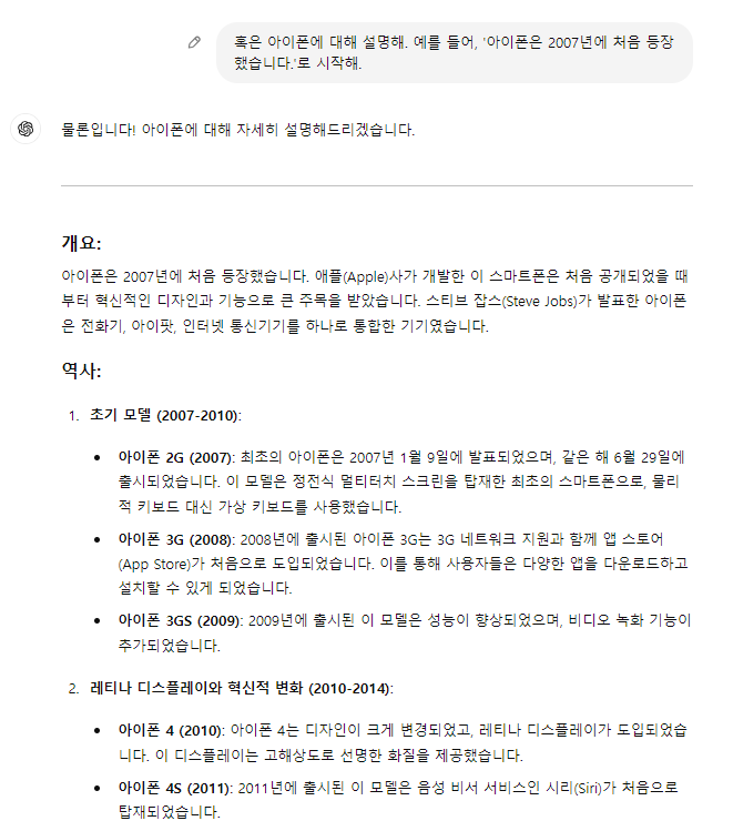 "혹은 아이폰에 대해 설명해. 예를 들어, '아이폰은 2007년에 처음 등장했습니다.'로 시작해."