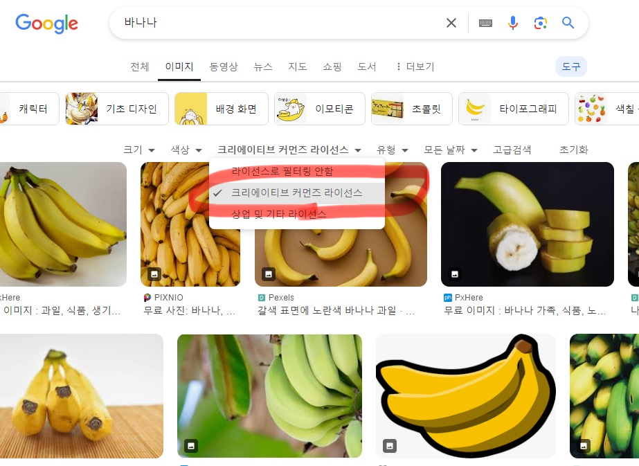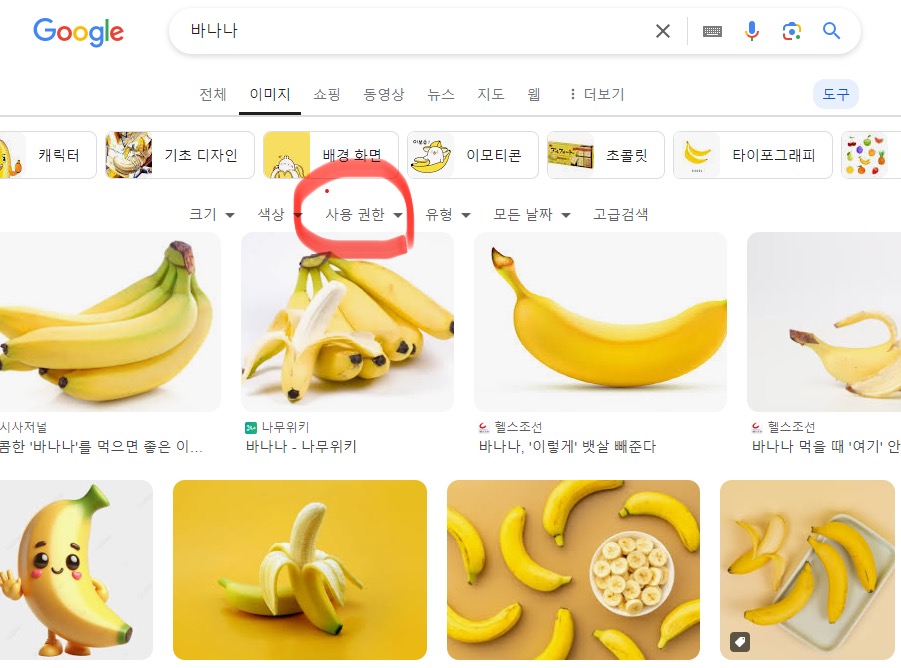 예를 들어 제가 바나나 사진이 필요해서 구글에 바나나를 검색해서 이미지 탭으로 들어왔다고 가정을 해보겠습니다.