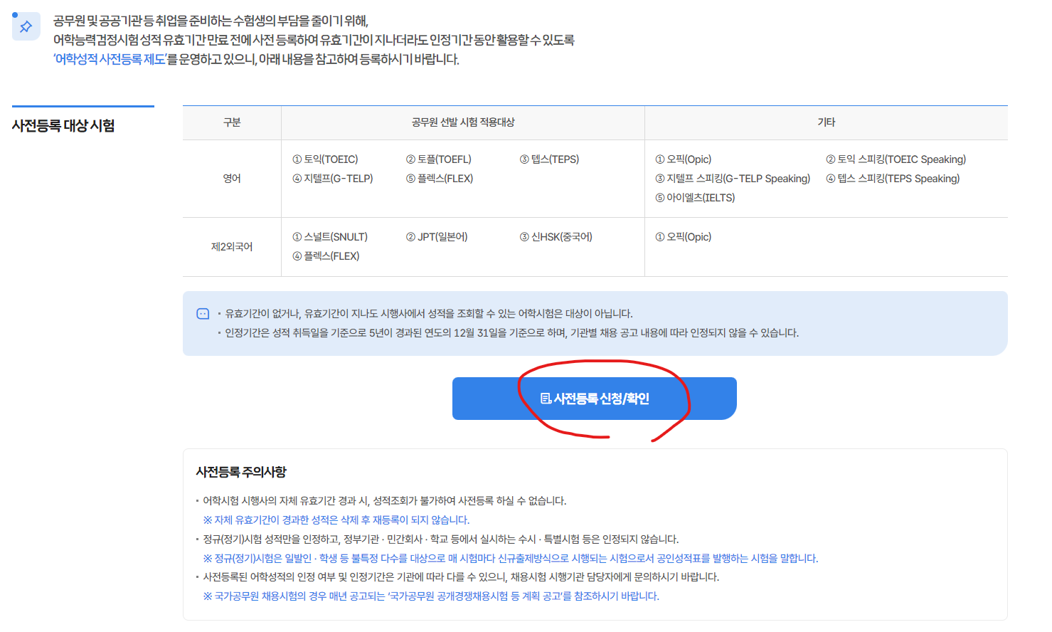 어학성적 사전등록 제도 이용 시 5년까지 유효합니다
