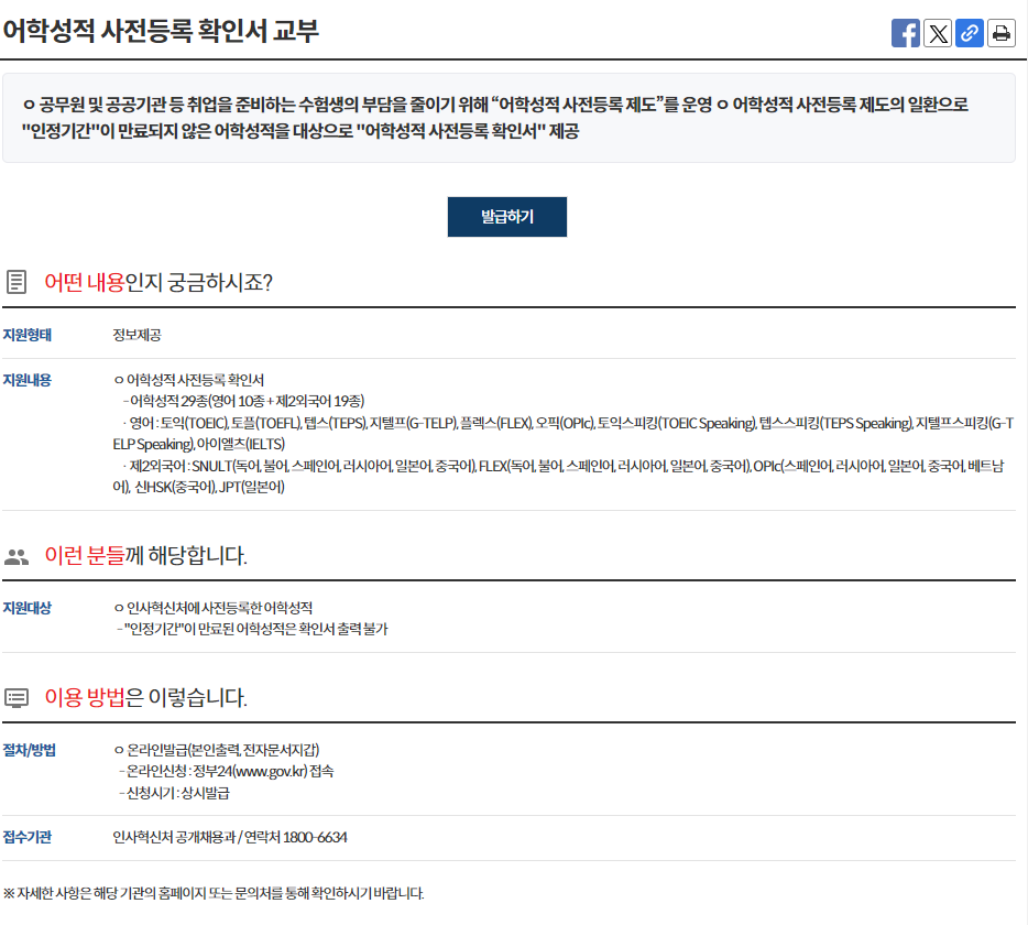 확인증 발급은 통합채용 포털이 아닌 정부24 홈페이지에서 가능합니다. 정부24 홈페이지 접속 - 어학성적 사전등록 확인서 교부 검색 - 본인 인증 - 발급하기 순서로 진행이 가능합니다.