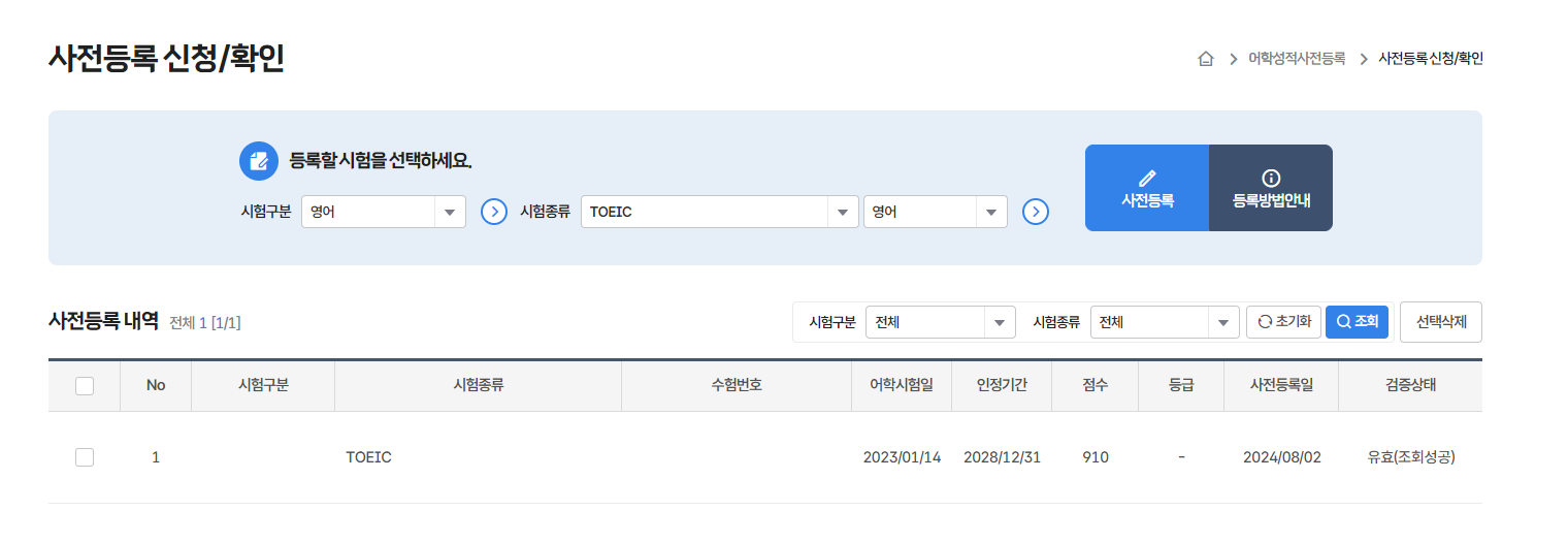 첫 번째, 어학시험 주관사의 유효기간이 경과하면 성적 조회가 불가능하기 때문에 사전등록이 불가능합니다.