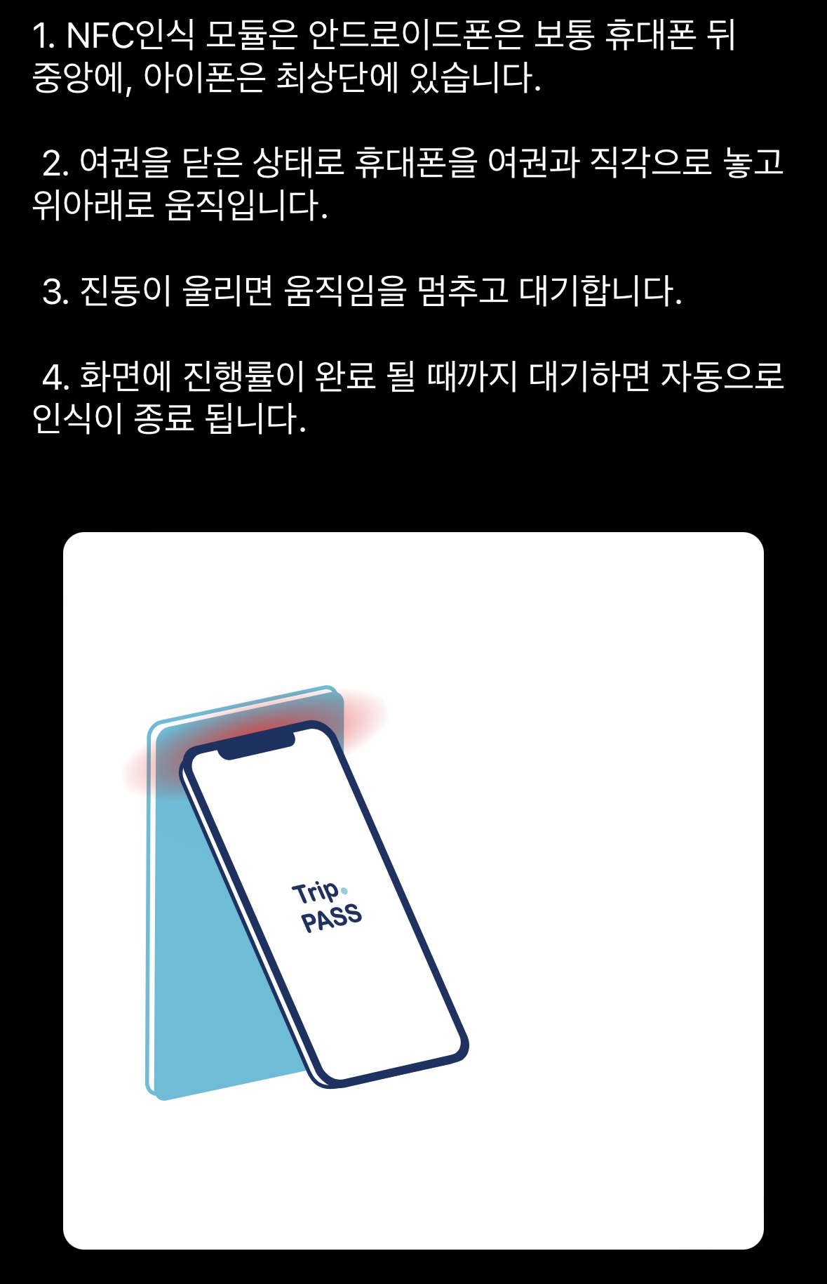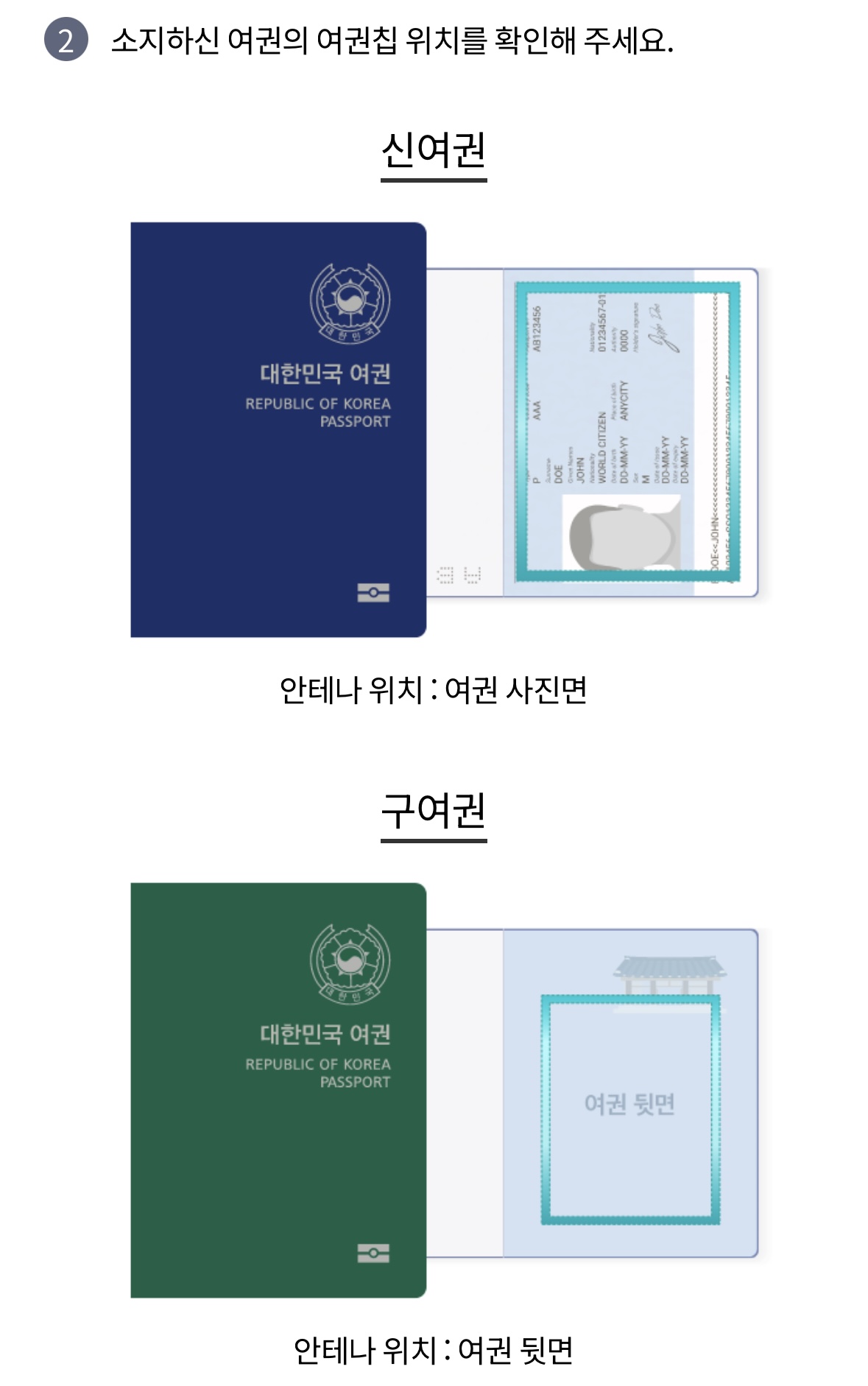 촬영이 끝나고 나면 여권에 장착된 전자칩을 인식하는 페이지로 넘어가게 되는데 신여권과 구여권의 전자칩 장착 위치가 서로 다르기 때문에 전자칩 위치를 먼저 확인하신 후에 진행하시는 것을 추천드립니다. 특히 아이폰의 경우 NFC칩 민감도가 안드로이드 기종 스마트폰보다 높기 때문에 칩 위치를 정확하게 파악하신 후에 진행하시는 것이 좋고, 아무래도 칩 인식이다 보니 케이스가 씌워져 있으면 인식 확률이 낮아질 수 있기 때문에 케이스 제거 후 인식하시는 것이 좋습니다.