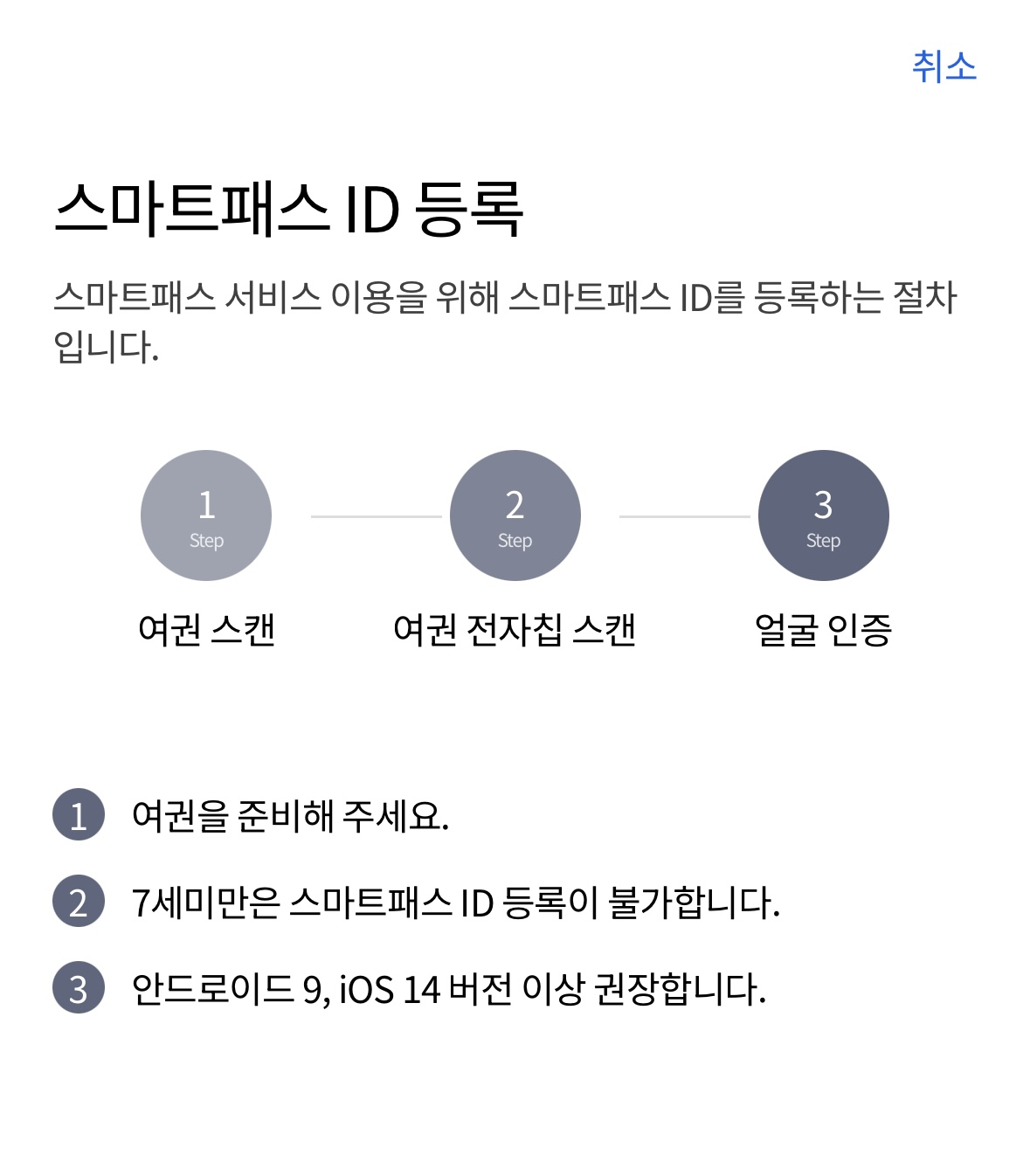 스마트 패스 등록과정은 여권 스캔 - 여권 전자칩 스캔 - 얼굴 인증 총 세 과정으로 이루어집니다. 여권을 먼저 준비하신 다여권 사진과 여권번호가 기재되어 있는 페이지를 가로 방향으로 펼친 후에 화면 크기에 맞게 촬영해 주시면 됩니다.