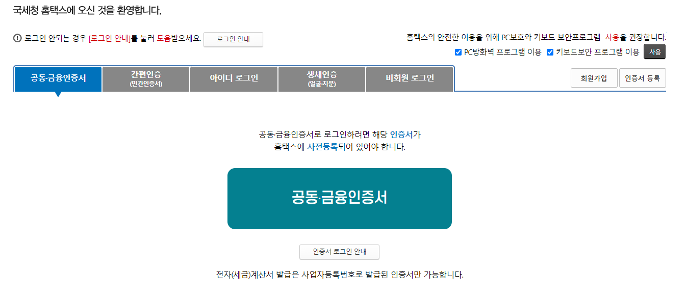 홈택스 메인 화면에서 로그인을 해줍니다. 네이버, 카카오톡, PASS로도 간편인증을 통해서 로그인을 할 수 있습니다.