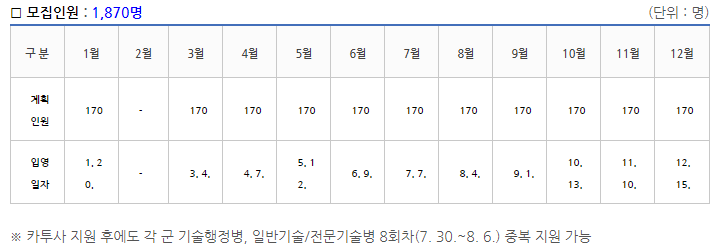 지난 7월 5일부터 11일까지 총 일주일 간 카투사 모집을 진행했습니다. 2025년 카투사 모집 인원은 총 1,870명이며 2월을 제외한 나머지 1월부터 12월까지 약 170명 정도의 인원을 각각 배정할 예정입니다.